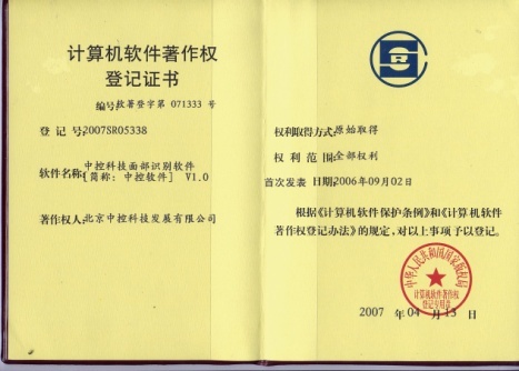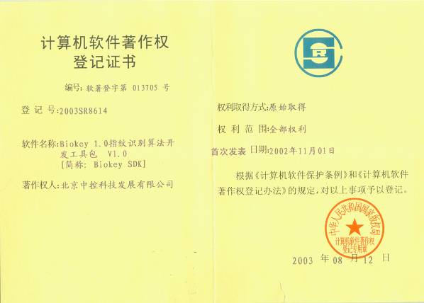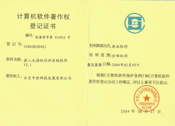 ZKFinger SDK著作權證書 嵌入式指紋識别算法軟(ruǎn)件著作權(quán)證書