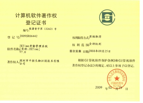 面部識别軟件著作權證書 ZKTime7.0 B/S考勤管理系統著作權證書