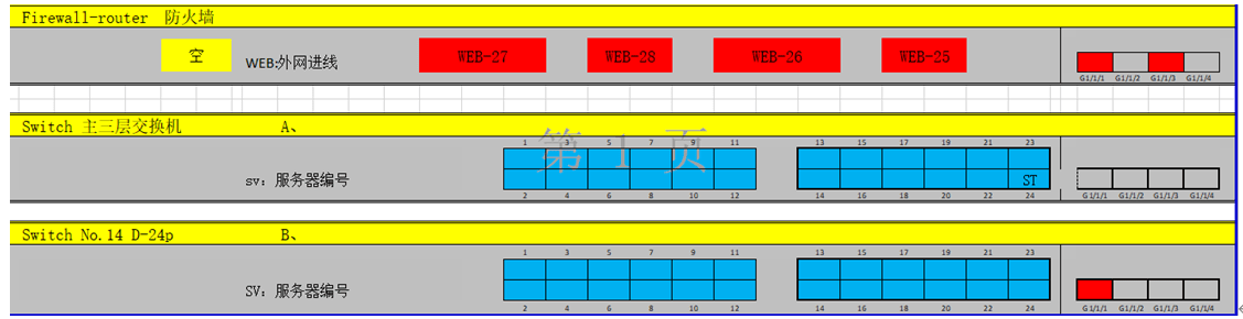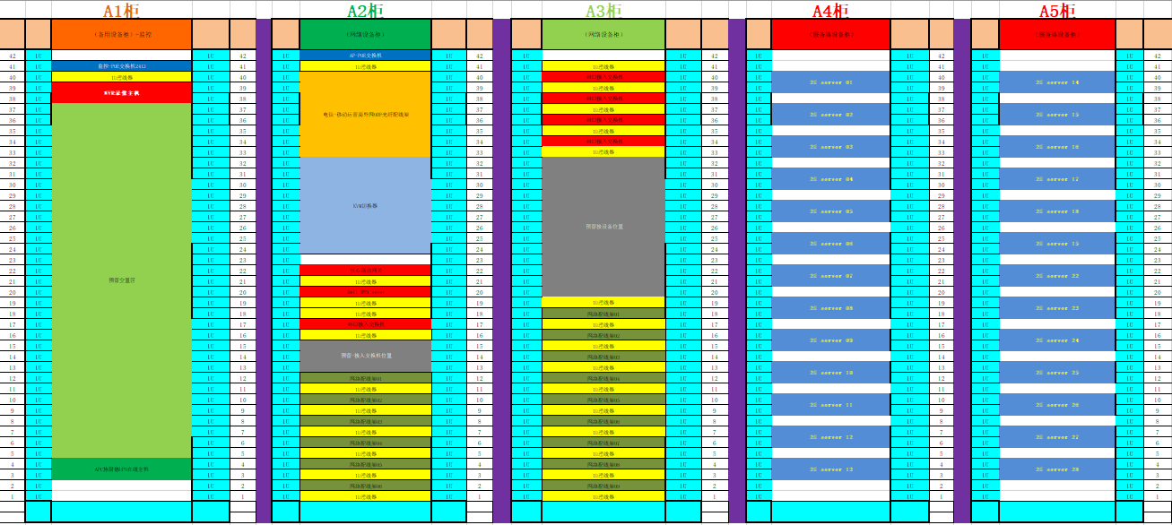 1.2 前期安排人員對現有路由器、交換機、服務器等需要搬遷至新機房的設備就行排查、並(bìng)以表格的方式記錄設備的電源功耗、阻抗、線路等信息。根據前期對設備的調研結果,計算出所有設備的總功率和新機房電源或者UPS的負載情況,並(bìng)結合新機房設備放置位置。根據前期調研結果,對設備、鏈路、光纖、電源線進行标識並(bìng)記錄,标記應統一規範且清淅明瞭(le)。