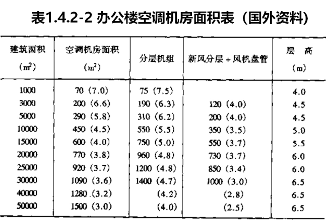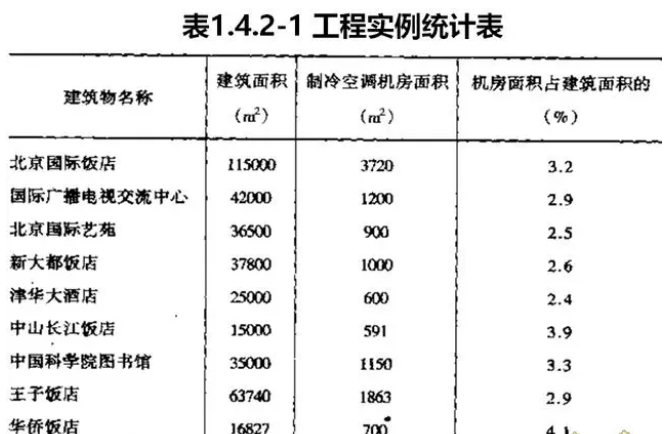 調制冷機房面積約相當於總建築面積的3%~7%。依建築規模及系統方式大有出入。列舉如下資料以供參考,表1.4.2-1爲工程實例統計表;表1.4.2-2爲辦公樓空調機房面積表(國外資料)。