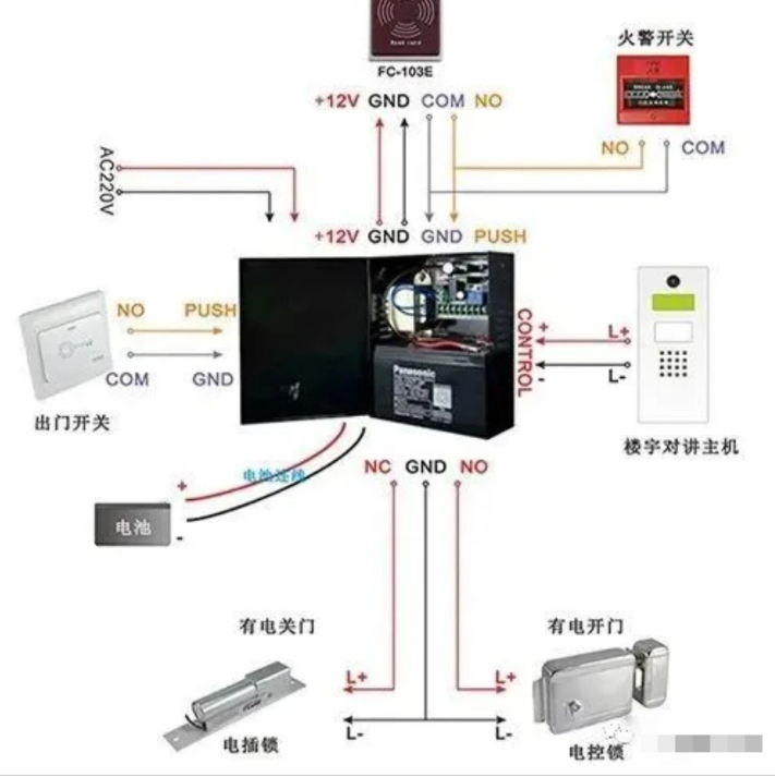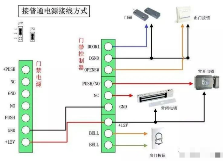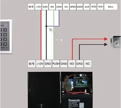 3、門禁主機上的PUSH端(開信号)接門禁電源的PUSH端。門禁主機上開門信号标是NO、NC的,通常接NO端至接門禁電源的PUSH端。