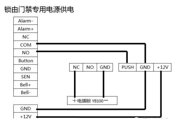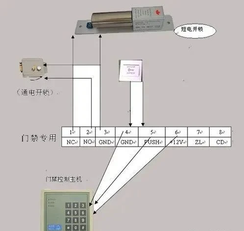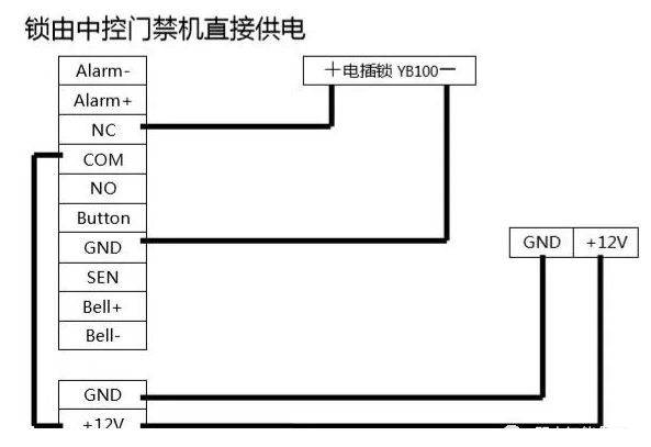 1、門禁主機(jī)上的+12V、GND端(門禁主機(jī)供電(diàn))接門禁電(diàn)源的+12V、GND端。