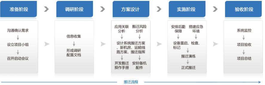 随著公司業務規模不斷擴大,深圳機房搬遷服務、南山機房搬遷方案、福田機房搬遷公司公司企業往往會新建更大規模的數據中心機房, 以擺脫老舊數據中心在空間及設備陳舊方面的制約,不斷适應業務發展新需求。 由於數據中心機房運行著企業核心 IT 系統,網絡數據中心搬遷不僅關系到大量服務器、存儲、網絡等設備遷移,更重要的是涉及業務系統邏輯關系的完整性和連續性。因此,如何把對公司業務系統的影響度降至低,是大多數衆多客戶機房搬遷所關注的核心問題。 作爲國内的第三方 IT 基礎(chǔ)架構綜合解決方案提供商,中德信通技在機房搬遷方面擁有豐富的經驗和大量的成功案例,緻力於(yú)爲客戶提供安全、高效、無縫的機房搬遷服務。 基於(yú)大量機房搬遷服務佳實踐的總結,中德信通制定瞭(le)科學、合理、規範的操作實施方案和緊急回退方案,確保客戶系統的平滑移遷,降低搬遷過程的巨大風險,使搬遷工作能夠在規定的日期内順利完成。 搬遷服務後(hòu),中德信通還爲客戶提供一定時間内的技術服務保障,確(què)保搬遷後(hòu)系統的穩定運行。 機房搬遷服務範圍 小型機(jī)、PC 服務器、存儲(chǔ)、網絡等。 機房搬遷目标 確(què)保搬遷設備(bèi)到達指定位置後的物理完整性。 確(què)保搬遷設備(bèi)到達指定位置後的功能完整性。 確(què)保搬遷設備(bèi)到達指定位置後的應用完整性。 機房搬遷流程 機房搬遷難點與對策 設備(bèi)數量多,結構複(fù)雜。設備、連線核對無誤;新機房網絡、KVM連線嚴格測試;分批進行搬遷控制風險。 網絡鏈路接換。鏈路接換需有時間承諾;網絡設備盡可能採用切換方式;搬遷網絡先行。 業務時間窗口限制。大限度地減少搬遷環節的操作時間;應急方案考慮充分。 應用關聯複雜。梳理業務關聯關系,從業務持續角度出發規劃搬遷方案。 核心應用系統遷移。新購核心業務系統必須經過應用嚴格測試;數據遷移方案需要預演。 應急環境所需備品及備機。對於核心系統協助搭建應急環境。 機房搬遷風險分析 内部風險:進度延遲、業務檢查、設備損壞、基礎設施、人員等。 外部風險:天氣情況、交通情況、運輸情況等。 單應用系統風險:核心業務風險、單應用系統數據備份風險、單應用系統遷移過程的備機備件風險。 機房搬遷組織架構