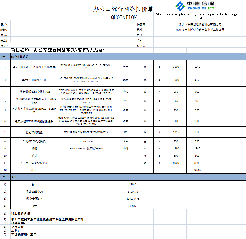 深圳網絡布線報(bào)價單2022年公司辦(bàn)公室網絡布線報價單方案:辦公室一層樓1500平方120個工作卡位!網線、電話線、電源插座、投影、無線AP、視頻監控;公司辦公室網絡布線報價要求低成本性價比高、簡單一點!根據客戶要求所以中德信通現場技術人員結合網絡布線公司提供如上圖的一份公司辦(bàn)公室網絡布線報(bào)價清單表!