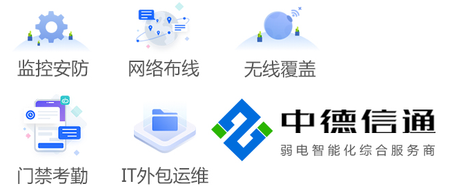 中德信通業務範圍:綜合布線、安防監控、網絡電話布線、監控布線(無線WIFI式)、商場(chǎng)防盜保警、POS消費收銀機、大屏LED顯示、電子圍欄、 橋架建設 、大型無線WIFI、停車(chē)場(chǎng)收費、門禁一卡通收費、公共廣播、手機信号放大、弱電工程(機房建設)