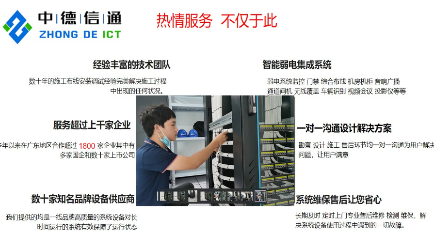 深圳安防監控弱電工程公司系統集成從事音視頻系統工程的設計、安裝、調試和産品,與多家連鎖酒店和超市達成合作夥伴關系,爲其提供安防弱電系統服務。完成瞭(le)各種工程案例,有著(zhe)豐富的大中型項目施工經驗,可提供免費到現場勘測,根據現場的情況報出詳細的價格清單。
