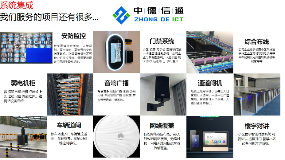 4、信息系統集成:智能樓宇系統、集團公司程控交換機、機房建設方案整頓、音樂伴奏、公共廣播系統、會議音響系統、電話交換機、防盜報(bào)警系統、樓宇對講系統、一卡通、停車場(chǎng)管理、消防設施等。