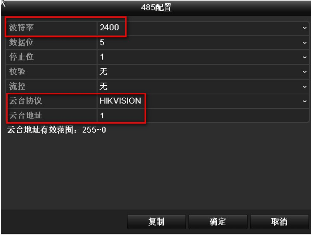 進入錄像機主菜單—通道管理—雲台配置,選擇對應模拟球機通道,點擊485配置。配置界面如圖:根據您球機上的撥(bō)碼填上對應通道的球機波特率、協議、地址位。點擊確(què)定,回到雲台配置界面(海康模拟球機出廠默認波特率2400,地址位0,能自适應Hikvision、Pelco-P、Pelco-D協議))。