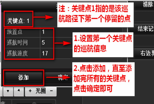 設置好關鍵點(diǎn)對應的預置點(diǎn),巡航時間與巡航速度,點(diǎn)擊添加,然後開始設置下一個關鍵點(diǎn)信息,設置完成所有需要的關鍵點(diǎn)後,點(diǎn)擊確(què)定。