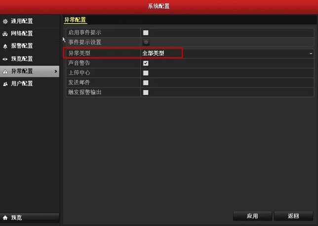 主菜單(dān)-系統配置-異常配置-異常類型,選擇“全部類型”,将聲音警告的鈎(gōu)取消掉,應用。