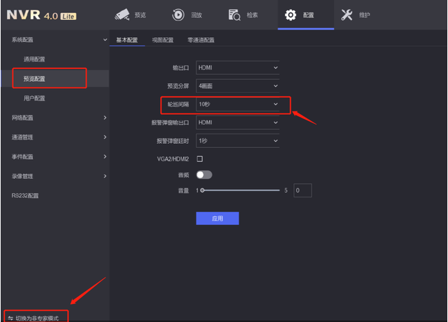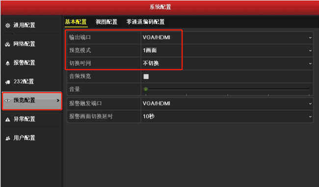 主菜單(dān)-系統配置-預覽配置-基本配置,選擇對(duì)應的輸出端口,預覽模式根據需要選擇畫面分割數,切換時間即畫面輪巡時間。