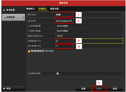 進入主菜單(dān)-硬盤管理-高級配置-存儲(chǔ)模式,選擇配額模式,選擇對應的通道,輸入分配給該通道的錄像配額大小。