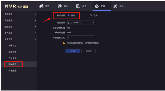 切換爲專家模式/工程模式,進入配置-錄像管理-存儲(chǔ)模式,選擇配額模式,選擇對(duì)應的通道,輸入分配給該通道的錄像配額大小。