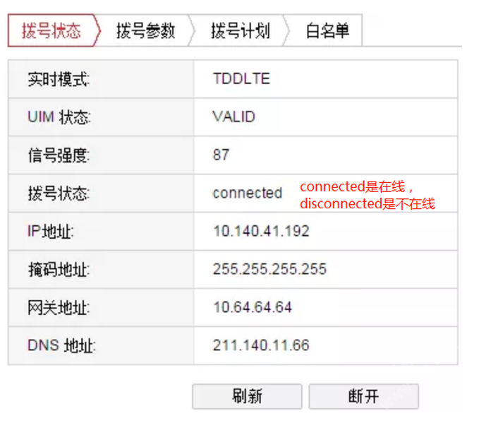 方法:通過IE浏覽器登錄設備(bèi)的IP地址,點擊配置-網絡-無線撥(bō)号選項撥(bō)号狀态正常是connected。(狀态不正常是disconnected)