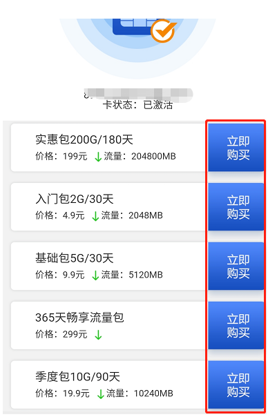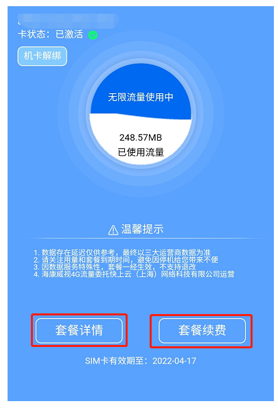 點(diǎn)擊用戶中心-流量服務-綁(bǎng)定物聯卡ICCID-綁(bǎng)定成功會顯示已激活-點(diǎn)擊對應卡-套餐續費