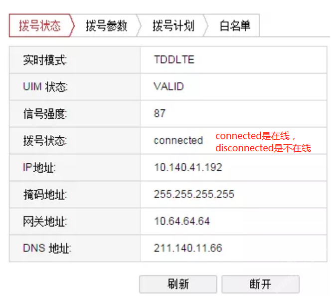 方法:通過IE浏覽器登錄設備(bèi)的IP地址,點擊配置-網絡-無線撥(bō)号選項撥(bō)号狀态正常是connected。(狀态不正常是disconnected)