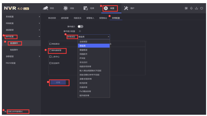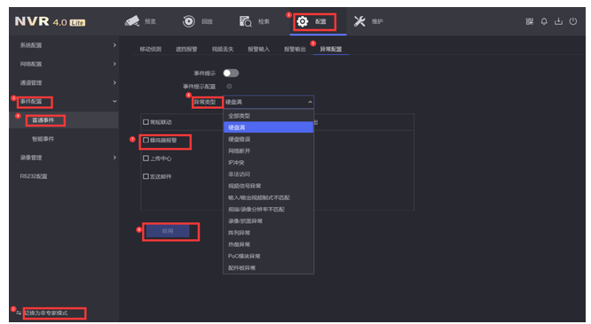 進入配置-左下角切換專家模式/工程模式-事件配置-普通事件-異常配置-異常類型選擇相應事件,将蜂鳴器報(bào)警前面的鈎去掉,點(diǎn)擊應用。
