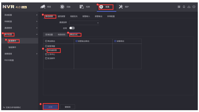 進入配置-左下角切換專家模式/工程模式-事件配置-普通事件,選擇查詢到的偵測(cè)報(bào)警類型,進入聯動方式,将蜂鳴器報(bào)警前面的鈎去掉,點擊應用。