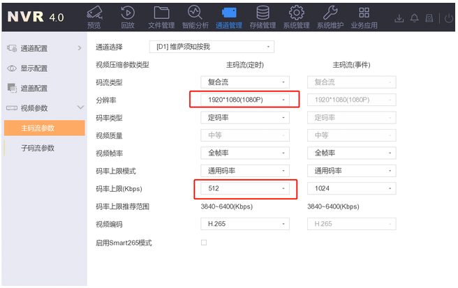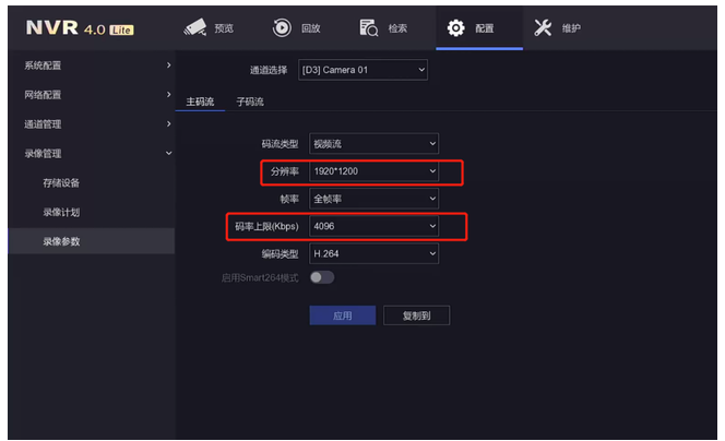 進入配置—錄像管理—錄像參(cān)數—主碼流,将主碼流的分辨率和碼率上限降低至錄像機(jī)可接入的攝像機(jī)分辨率和碼率上限。