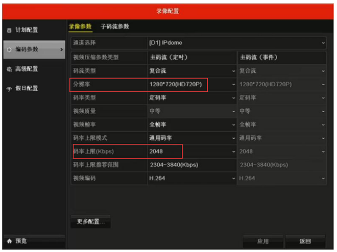 進入錄像配置—編(biān)碼參(cān)數—錄像參(cān)數,将錄像碼流的分辨率和碼率上限降低至錄像機可接入的攝像機分辨率和碼率上限。