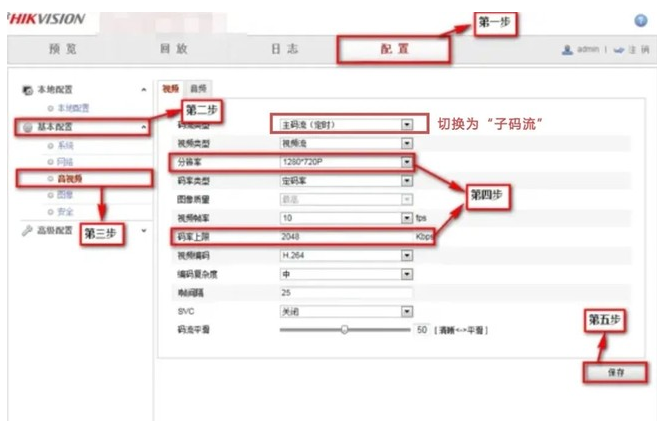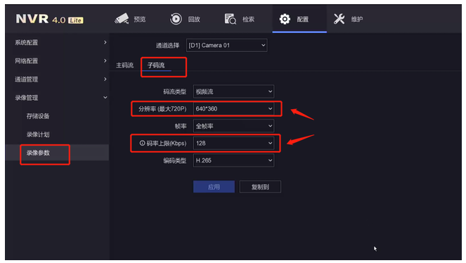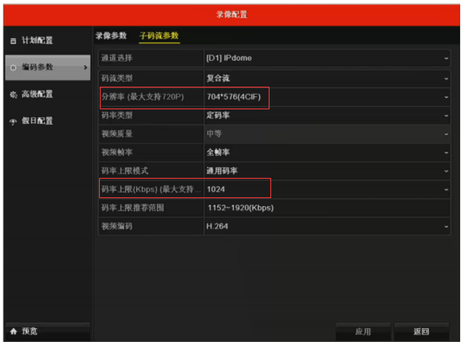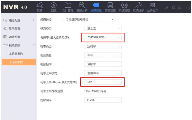 多(小畫(huà)面)顯示資源不足,需要将子碼(mǎ)流的分辨率和碼(mǎ)流上限降低,一般子碼(mǎ)流的碼(mǎ)率上限建議降低到512k, 分辨率建議在4CIF 模式。
