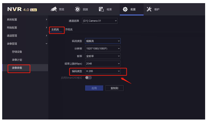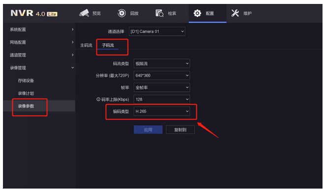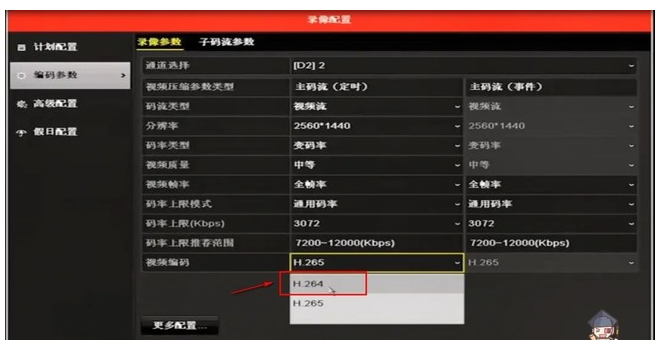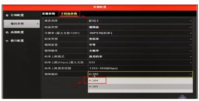 操作路徑:配置—錄像管理—錄像參(cān)數—主碼流/子碼流—視頻編(biān)碼,切換成H.264編(biān)碼方式。