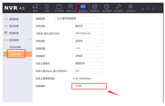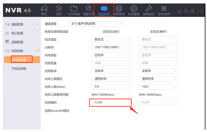 操作路徑:通道管理—視頻參(cān)數—主/子碼流參(cān)數—視頻編(biān)碼,切換成H.264編(biān)碼方式。