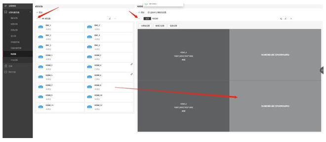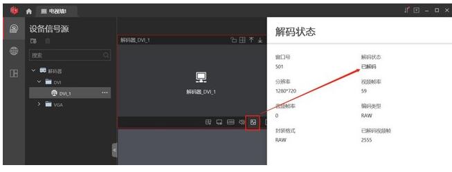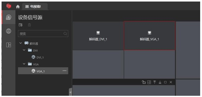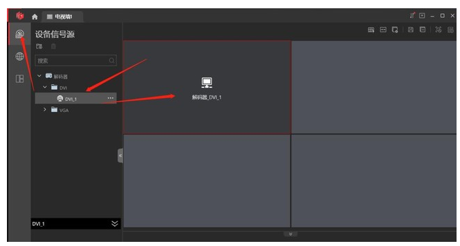 将電(diàn)視牆和解碼器展開,把解碼器對應輸出口拖動到右邊(biān)電(diàn)視牆上。