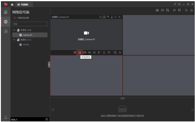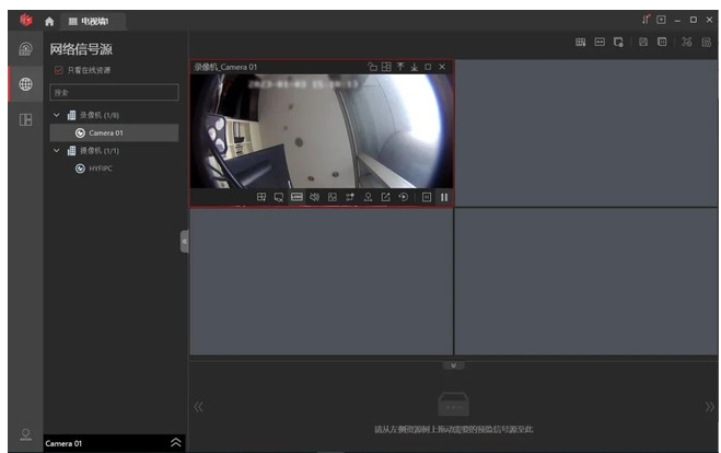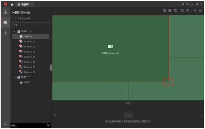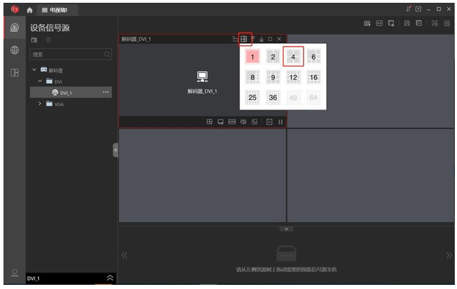 解碼上牆成功後,點(diǎn)擊右上角的窗口分割圖标,選擇對應的分割數,拖動設備(bèi)信号源到窗口即可。