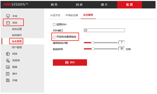 1、通過局域網訪問攝像機,點(diǎn)擊配置-系統-安全管理-安全服務,将非法登錄鎖定關閉(bì)。