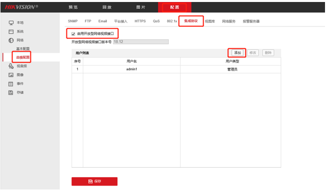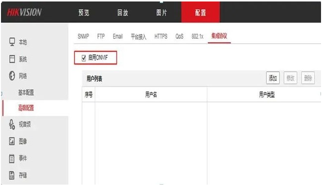 2、點(diǎn)擊(jī)配置-網絡-高級配置-集成協議,啓用ONVIF。