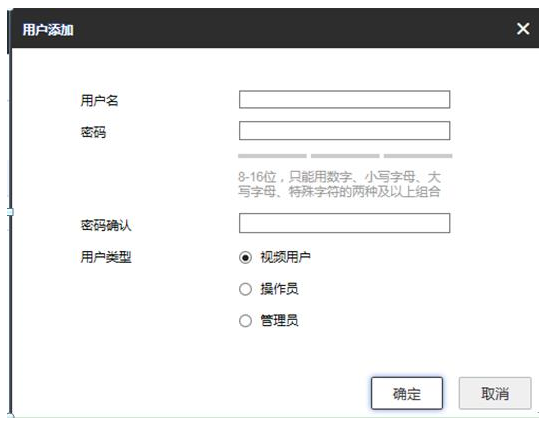 3、點(diǎn)擊添加,用戶名和密碼等級要求和設備(bèi)激活時設置的用戶密碼等級要求一緻。建議設置成和攝像機激活密碼一緻,用戶類型選擇管理員。