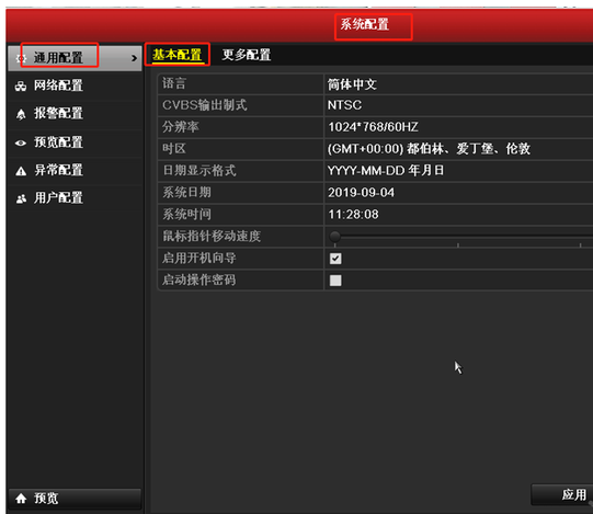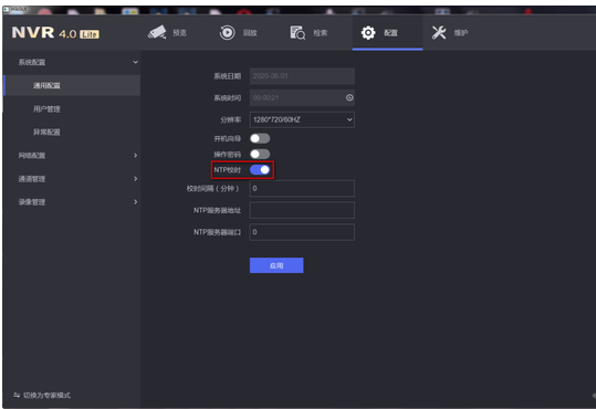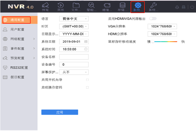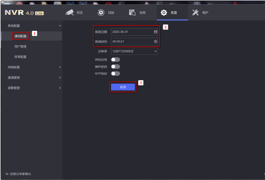 進入配置—通用配置,手動調(diào)整系統日期以及時間,點(diǎn)擊"應用"保存。