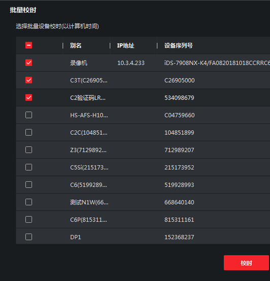 右上角工具-批量校時,勾選需要校時的設備(bèi),點(diǎn)擊校時即可對設備(bèi)進行校時