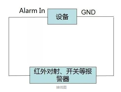 報(bào)警輸入隻需要接入一個開關量信号,所以不區分正負極,Alarm In和GND直接和報(bào)警輸入設備(bèi)的接線連接即可。
