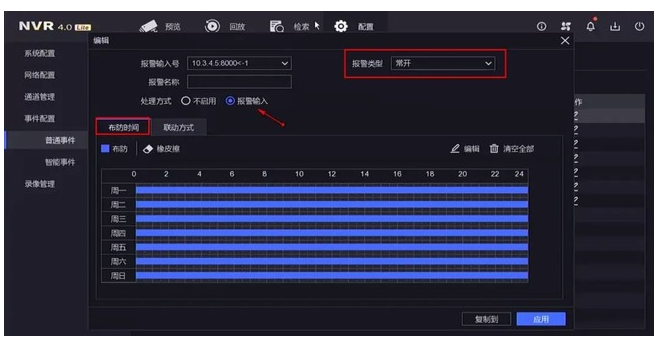 2.報(bào)警類型:根據報(bào)警輸入設備(bèi)選中對應的報(bào)警類型,報(bào)警輸入是常開就選擇“常開”,處理方式選擇“報(bào)警輸入”。