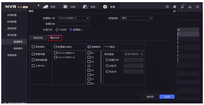(如接瞭(le)第一路報(bào)警輸入就選擇“IP<-1”,IP對應的是通道的IP,選擇對應通道的攝像機進行聯動)