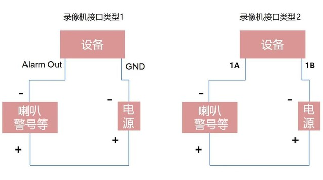 步驟一:錄像機上的“Alarm Out”(或1A)接口接報(bào)警輸出設備(bèi)的“負極”。