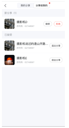 在我的-分享設置-分享給(gěi)我的列表中可以看到所有被分享的設備(bèi),如待接收設備(bèi),支持進行接收/拒絕操作。