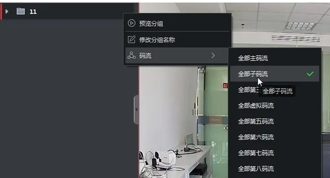 方法一:在主預覽界面,選擇對(duì)應的監控點(diǎn)文件夾,鼠标點(diǎn)擊“更多”,選擇“碼流”-“全部子碼流”,使用子碼流預覽就好啦~