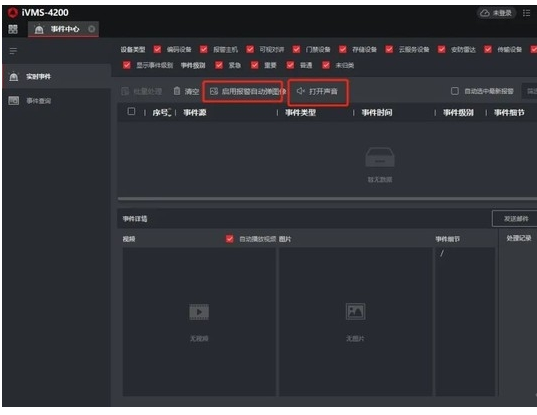 進入事件中心界面,把“啓用報(bào)警自動彈(dàn)圖”和“打開聲音”開啓~