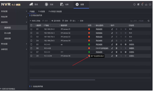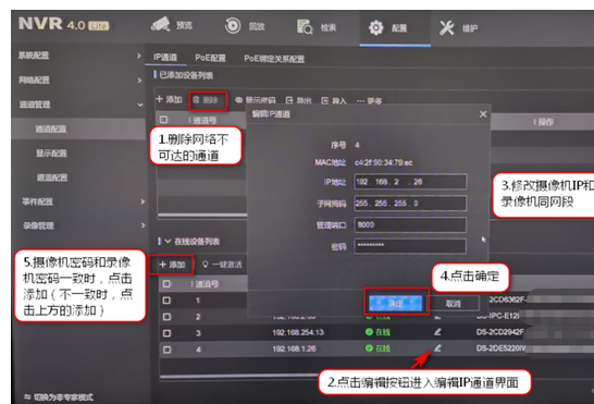 方法:進入配置—通道管理—通道配置—IP通道—在線設備(bèi)列表裏找到已删除攝像機,選中攝像機,點擊“編(biān)輯”,修改攝像機IP與錄像機同網段,後再點“添加”輸入攝像機信息即可。