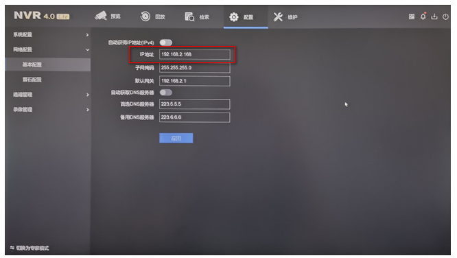 如果能刷新出攝像機,則需要檢查刷新出來的攝像頭的IP地址是否與錄像機IP地址在同一個(gè)網段,我們可以進入配置—網絡配置—基本配置界面確(què)認錄像機的IP地址: