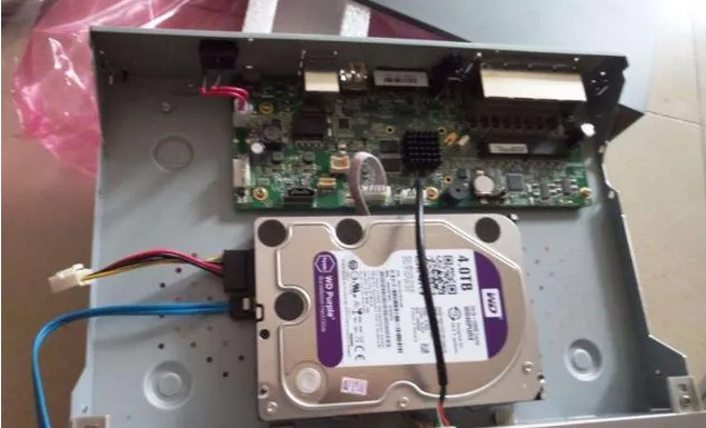 打開錄像機的所有螺絲,取下蓋闆,把硬盤安裝進錄像機裏面。把随機帶的硬盤數據線和硬盤電源線一頭接入錄像機主闆,一頭接入硬盤。然後蓋好錄像機蓋闆。如下圖: