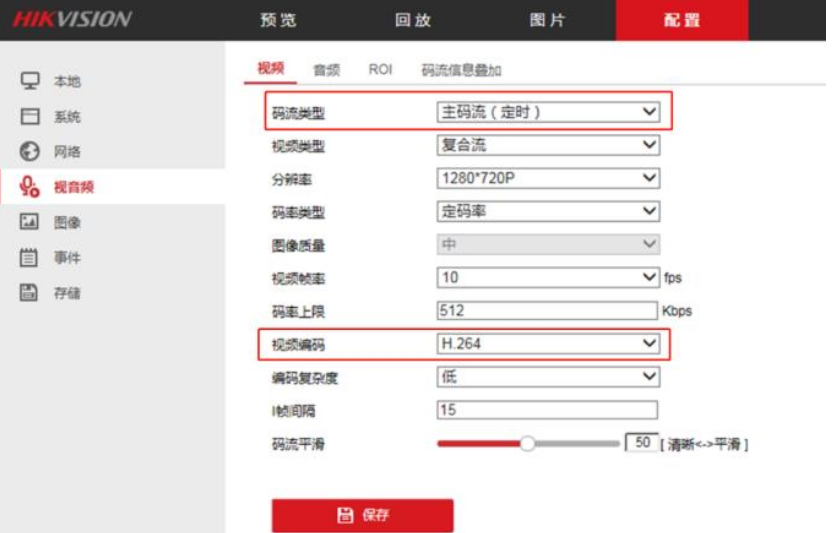 使用電腦浏覽器打開攝像頭的管理IP WEB頁面,輸入用戶名和密碼登錄,進入配置-視音頻-視頻,将主碼流的視頻編(biān)碼改成H.264,並(bìng)保存。