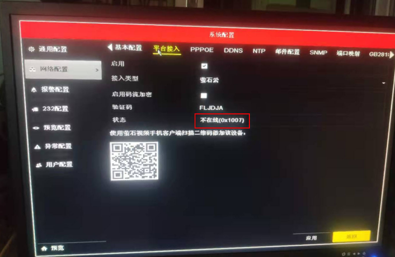 一客戶反映手機無法查看監控,首先右鍵主菜單(dān)-系統設置-網絡設置-平台接入,如圖顯示不在線,表示錄像機沒有正確(què)連接到網絡。