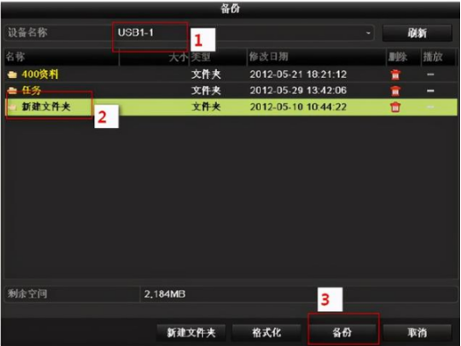 此界面顯示的是U盤或移動硬盤的現有文件,選中一個目的文件夾後,點擊“備(bèi)份”按鈕,錄像機會自動将對應通道當(dāng)天所有錄像文件備(bèi)份到該文件夾裏。