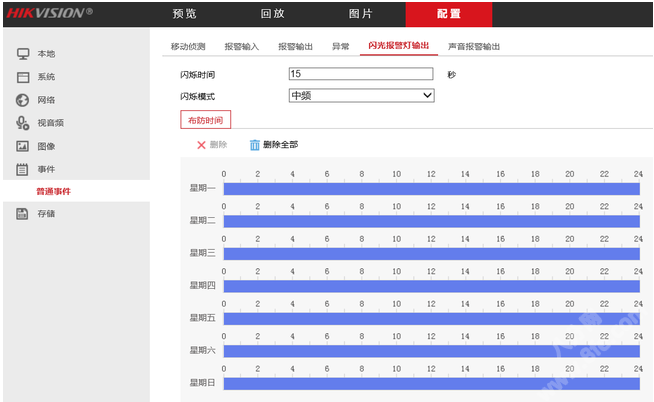 進入事件-普通事件-閃光報(bào)警燈(dēng)輸出頁面,設置閃光燈(dēng)閃爍時間和閃爍頻率(閃爍頻率太快時,即爲常亮)。