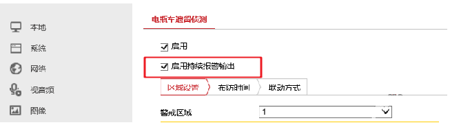(1)開啓持續報(bào)警輸出:隻影響相機ALARM端子的報(bào)警輸出,即:若算法持續檢測(cè)到電瓶車目标在相應區域,則報(bào)警持續的輸出;此時,報(bào)警輸出的延時時間建議配置爲5S。