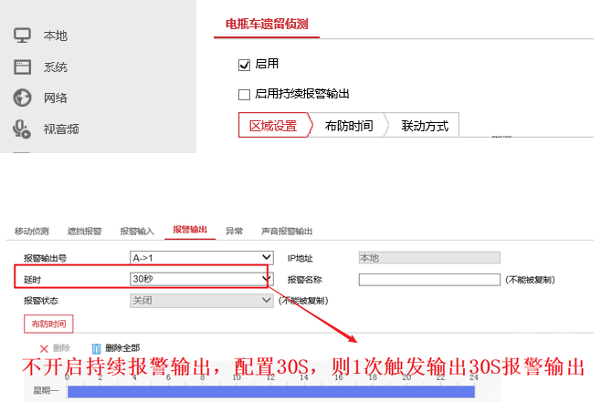 (2)不開啓持續報(bào)警輸出:隻會影響相機ALARM端子的報(bào)警輸出,即目标進入後,觸發相機報(bào)警輸出,報(bào)警輸出的持續時間和設置的延時時間強相關。例如,報(bào)警的延時時間配置爲30S, 則當檢測到電瓶車,並(bìng)聲音警戒後,ALARM輸出的報(bào)警輸出時間爲30S,即使電瓶車立刻離開,也會等到30S結束。